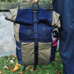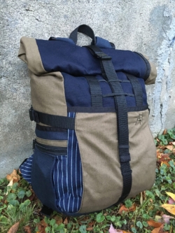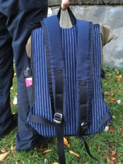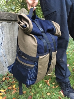This day-bag was designed with my needs in mind! A bag with a pocket for everything. A stretchy water bottle sleeve, a zipper pocket for wallet and phone, a slip pocket for my charger and nicknacks, and lastly a large front pocket that I can gain access to while wearing. On the right side it has a zipper the full length of the bag to allow quick interior access. When the side is oppen there is a safe interior zip pocket for hidden cash, passport and other secret things. Buckels are zink alio, side relise with tension locks that helps keep the back pack colapsed tight and stay slimm. Fabric is sourced from old sample swatches of japanese cotton with indigo die from Three Looms. This bag can easly hold up to 30 liters of day to day stuff such as, watter, lunch, laptop, sketchbook, sweater, umbrella, and dancing shoes for the night. Now I can proudly advertise my skill and craft.